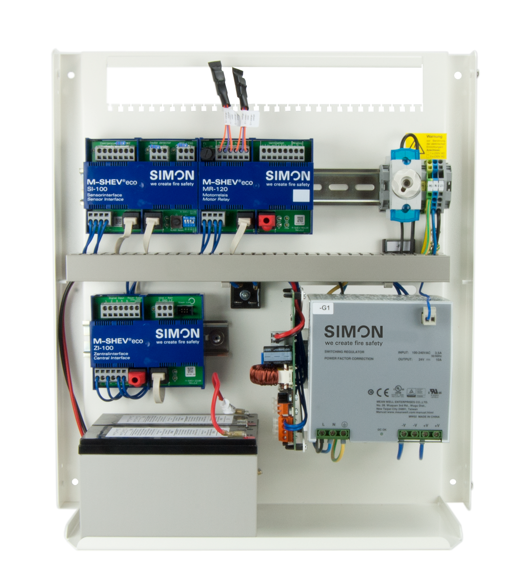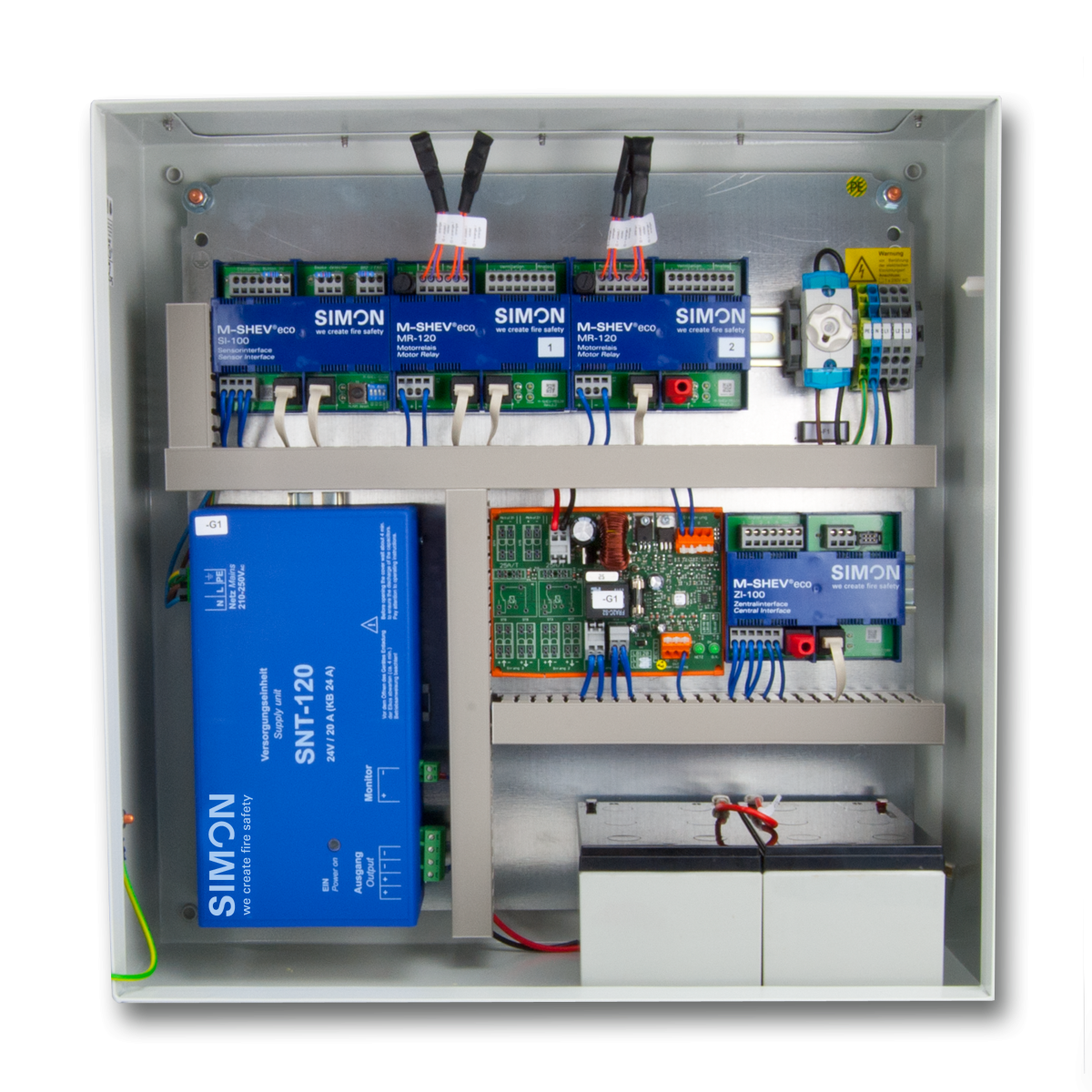 The M-SHEV 10 AP eco and the M-SHEV 24 / 1-2 eco also provide the full functionality of a standard M-SHEV supplied by the factory. The inputs and outputs of the various modules are still exists and available as described in the operating instructions. However, settings can no longer be made via SIMON LINK, only diagnostic data can be read out. These are the perfect control systems for all projects in which a standard control system meets the requirements of the fire protection concept.